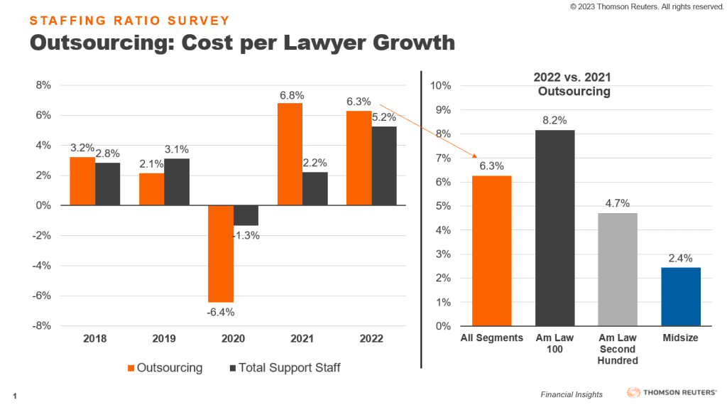 Outsourcing is a Growth Trend, Says the 2023 Staffing Ratio Survey by Thomson Reuters, which notes that almost two-thirds of law firms are reported to have outsourced at least one role during 2022, highlighting an increased dependence on these services, considered for fluctuating demands.