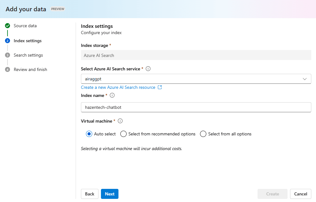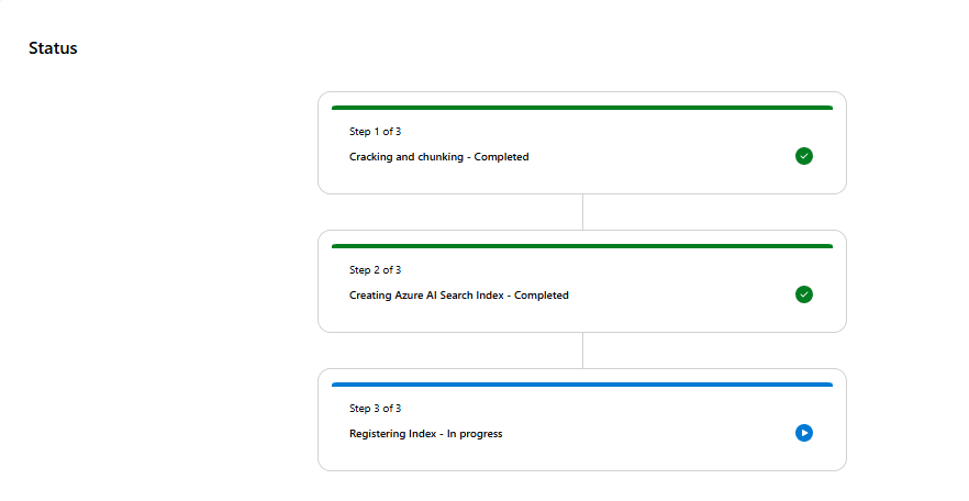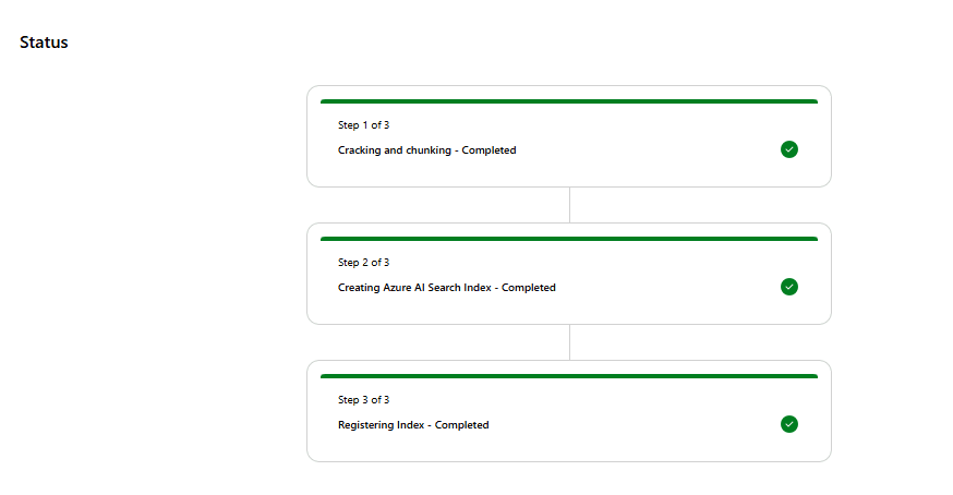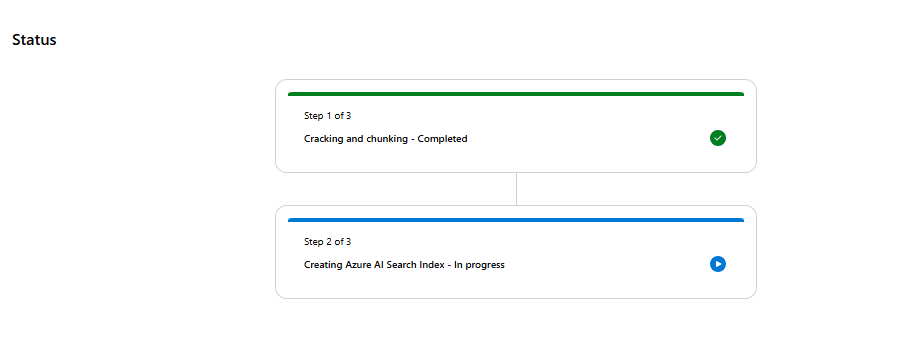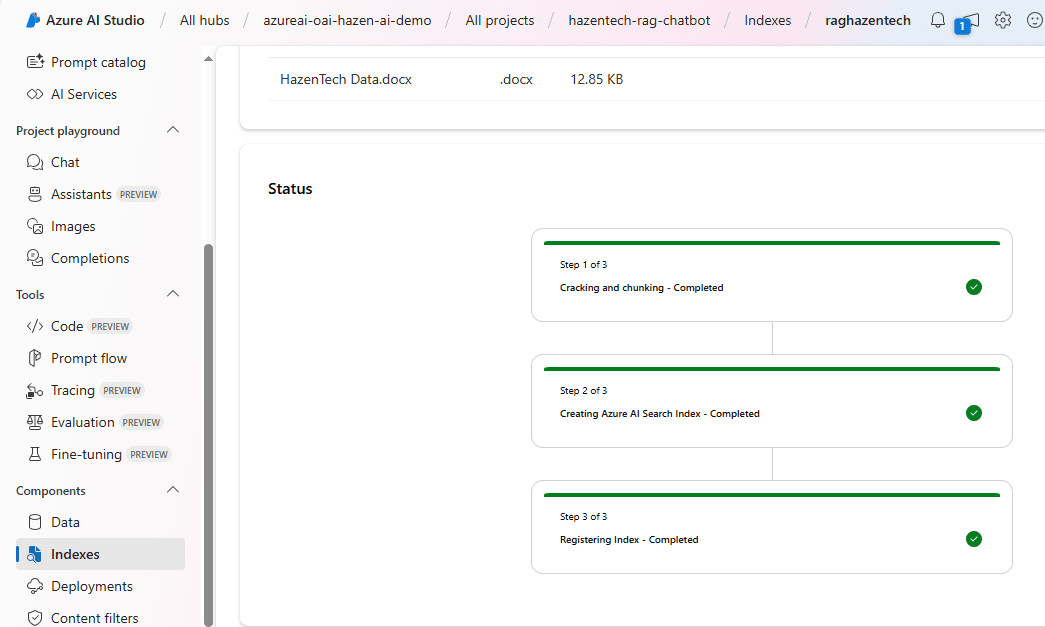 Once the data is uploaded into the embedding model it will crack and chunk the document into manageable pieces, then using Azure AI Search the whole document will be indexed. The indexes will be registered and will make the data ready for the chatbot to generate context-based answers.