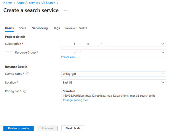 After deploying the generative and embedding models, the next step is to create Azure AI Search, also known as Azure Cognitive Search. This service is responsible for performing advanced contextual searches and retrieving relevant information from data sources. Azure AI Search functions as part of the RAG (Retrieval-Augmented Generation) approach by searching through data sources, retrieving information, and feeding it to the generative models, which then generate responses based on the provided context. To set up a RAG-based chatbot, create the Azure AI Search service and configure it with the appropriate settings.