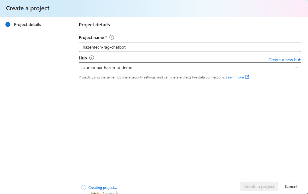 To create a chatbot based on Retrieval-Augmented Generation (RAG), the first step is to create a new project in Azure AI Studio. This involves setting up an appropriate project name and selecting the right hub for shared resources and security settings.