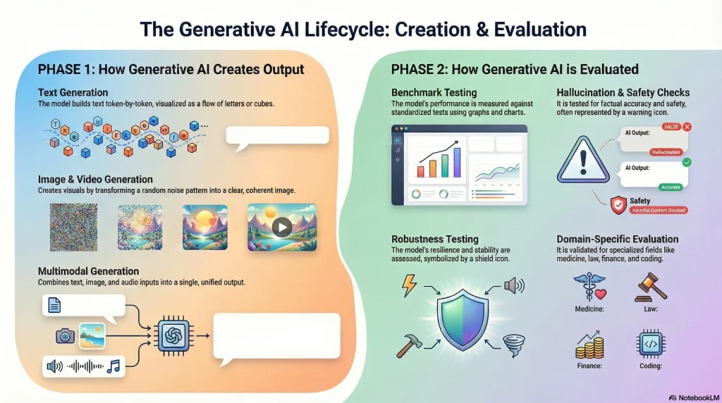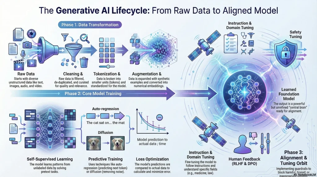 Generative AI follows a structured pathway from data preparation through evaluation. Each phase matters because the quality, safety, and usefulness of any model depend on how well these components work together.